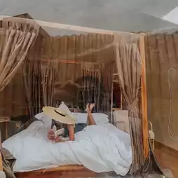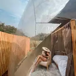 There are 2 bubble domes on the left and right. To enter and exit, you have to zip up and close the door quickly because it is a bubble that is inflated all the time. The bubbles here are not very hot and are private because the back half is completely closed. The air is cool. It takes a while because during the day, they are exposed to the sun.