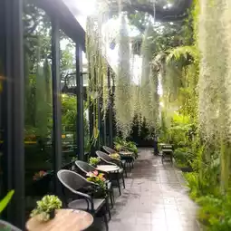 Here, there are both food and beverages, homemade bakery, both indoor and outdoor zones. If you come in the afternoon, you'll get sunlight shining on the leaves, it's very beautiful. It's in the Muang Thong Thani area, it's a secret shop, really top secret, you have to turn around a bit. I recommend you pin it according to the GPS.