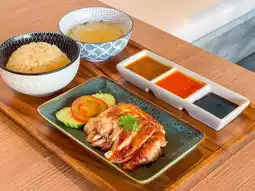 Fragrant rice with grilled chicken, soup, and delicious dipping sauce
