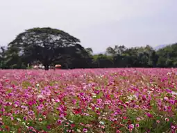 Today, we’re taking you on a trip to Pak Thong Chai District in Nakhon Ratchasima Province. Our destination is Jim Thompson Farm, a place filled with colorful flower fields and various plants in full bloom. Each year, the blooming period varies, so be sure to check the farm’s official page for updates. During our visit, the flowers were in full bloom, and the farm’s vast area was truly impressive. If walking becomes too tiring, there’s a tram service to take you around and stop at different spots for photo opportunities with the flower fields. Additionally, the farm offers local products such as handmade textiles, fresh produce, and other items, allowing visitors to support the local community and promote cultural preservation.