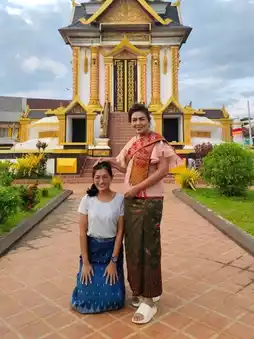 After giving alms, we took a picture in front of the City Pillar Shrine of Nakhon Pakse, which is near Wat Luang.