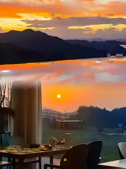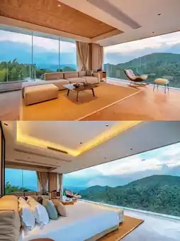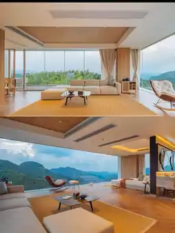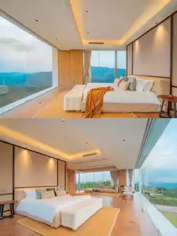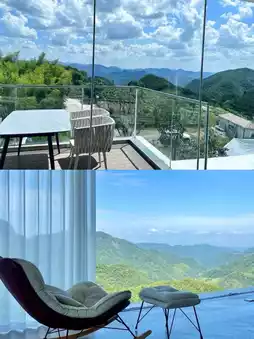 The overall architectural style combines modern and traditional elements, and the wooden structure inside gives a warm and simple feeling. Every room has a view of the sky and natural mountain scenery.