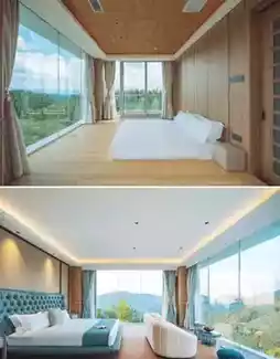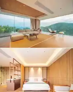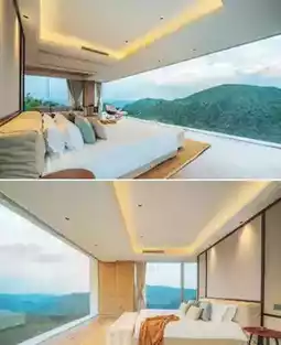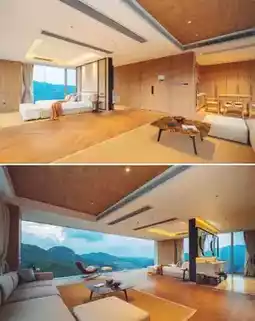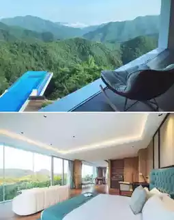 The pristine white structure blends into emerald tea fields, with floor-to-ceiling glass walls framing panoramic views of distant mountains, bamboo groves, and clouds—every window a living ink painting. The iconic cliffside infinity pool mirrors the sky; dip into cool mountain springs while overlooking the canyon for Insta-worthy shots! Zen-inspired common areas feature raw wood and bamboo weavings, with a tea platform suspended above the clouds—perfect for morning meditation.