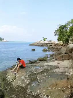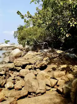 After soaking in the temple’s peaceful energy, we made our way to Pantai Pasir Giam. The beach was stunning—white sands, crystal-clear water, and the tropical beauty of shady palms and boulders scattered along the shore. It was an idyllic spot for snorkeling and unwinding.