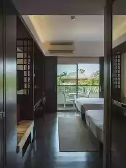 As soon as I entered, the dark-colored wooden interior caught my eye. The deluxe room is a double room, and there are two queen beds,