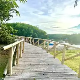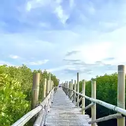 The path to the sunset point through the forest path that continues on the bamboo bridge. This forest path is also famous as the sunset, and it is a natural photo spot with lush mangrove trees, blue sky, and bamboo bridge.