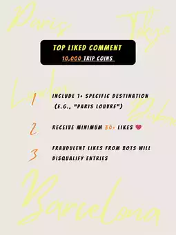 1️⃣Top Liked Comment: Share your dream destination + hit 30+ likes to win 10,000 Trip Coins.