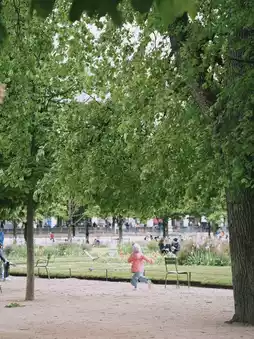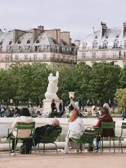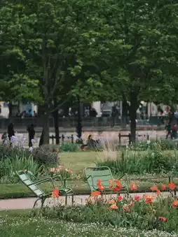 It takes only a few minutes to walk from the Louvre to the Tuileries. The green chairs in the garden should be wet, but now they are full of people. They are like mushrooms after rain. As soon as the sky clears, they grow everywhere in the garden.