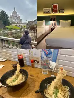 Even on a cloudy day, the Eiffel Tower was still beautiful. It had a calm, romantic atmosphere, quite different from the clear skies. Afterwards, we slowly climbed up Montmartre, taking in the beautiful works of art and Parisian life in each alley. For dinner, we warmed ourselves with a warm soup at the Japanese udon restaurant Sanukiya, and returned to our hotel to end the day. Breakfast, the aroma of croissants and coffee, perfectly encapsulated the relaxed atmosphere of Paris.