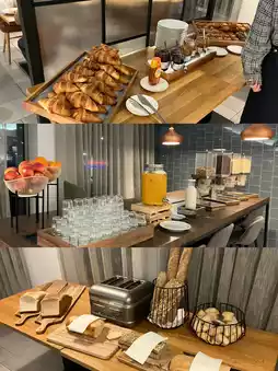 This hotel is conveniently located near the airport, and offers a clean breakfast buffet and a quiet environment. The breakfast menu includes fresh fruit, warm bread, coffee, and omelets.