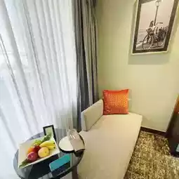 The spacious rooms are elegantly designed with modern amenities, ensuring a comfortable stay. The highlight is the expansive pool area surrounded by lush gardens, providing a resort-like feel in the city.