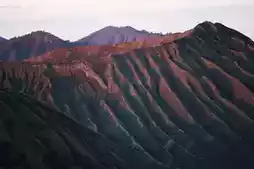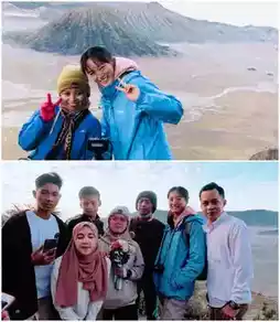 The sea of clouds I had hoped for didn't appear, but the unique volcanic landscape still provided a tremendous visual impact. The volcanoes seemed to be gathering the energy to break free from the stillness. Turning my head, I saw Cemoro Lawang village and beyond, where the pale pink sky met the mist clinging to the lush valleys and plateaus, creating a scene of ethereal beauty and purity. It was truly amazing: on one side, the barren land created by volcanic eruptions, awe-inspiring; on the other, the farmland, forests, and villages nurtured by volcanic ash, full of vibrant life and reassuring.