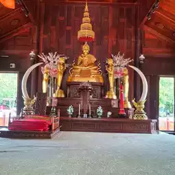 🏠 The wooden ordination hall situated in the middle of a pond, housing the principal Buddha image, Luang Phor Nak Prok Kaew Mani Chot.