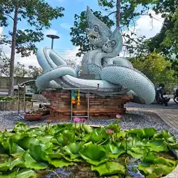 🐉 Statues of Pu Sri Sutho and Ya Sri Pathumma, along with large Naga sculptures encircling the ordination hall. At the four corners of the pond, there are Naga statues with 3, 5, and 7 heads.