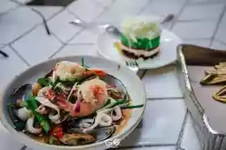There's a bar with drinks, coffee, and sweet smoothies. Or, sip on a light cocktail. They also serve beer, wine, Thai, and Western food. I'm telling you, the spicy salad is absolutely delicious. And to top it off, try some dessert.