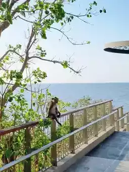 After that, we stopped to see the view and the monkeys at the Bangsaen-Khao Sam Muk viewpoint. The monkeys here aren't as fierce as other places. They don't snatch or steal things unless they're food. So, be careful.