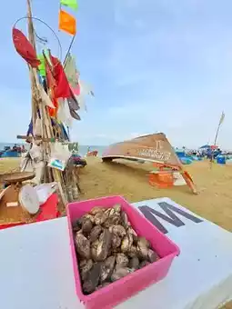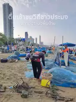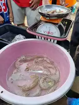 After we were full, we went back to the hotel to rest and get some energy to wake up and go to the local fishing market at Jomtien Beach. The fishermen will bring their boats to shore with the shrimp, shellfish, crabs, and fish they have caught from around 5 to 7 in the morning. There are a lot of people on Saturdays and Sundays, so the market will close earlier than on weekdays. The highlight of this market is the fresh food because it is only sold day by day.