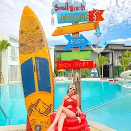 The highlight of this place is the large white swimming pool in the Mediterranean style, along with many fun activities such as paddleboarding, taking cool photos, or playing with the black submarine scooter. You can also enjoy the beautiful water park and many other interesting activities such as Scooter l Onsen l Steam l Sauna l Fitness l Kids club, all in one place.