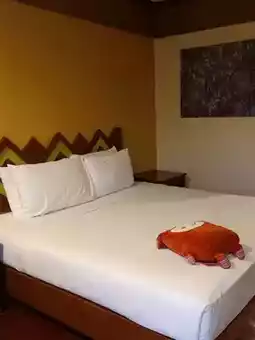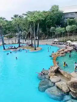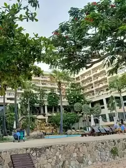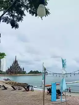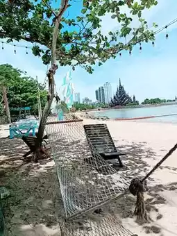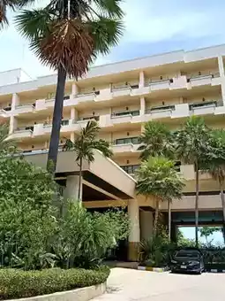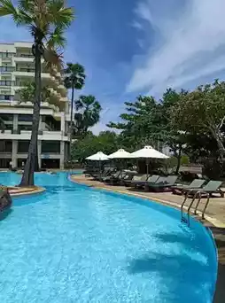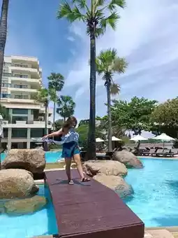 Garden Seaview Resort, a hotel with a beautiful swimming pool in North Pattaya. Here, there is a private beach, spacious accommodation, a large swimming pool, and most importantly, there is a children's pool for playing. Those who can't swim can play because there are both shallow and deep zones. There is a small bar in the building called Sip Bar for sitting and drinking and ordering food. The hotel is located on the beach. It is a private beach. There is a place to play in the water and chairs to sit and relax on the beach. Watching the sunset in the evening is very cool. You can see the view of the wooden castle. It is suitable for couples and families. Anyone looking for accommodation in Pattaya, I recommend this place.