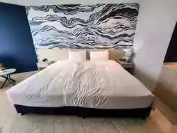 The atmosphere in the room looks warm. The room is decorated in white. The background at the head of the bed is a blue-blue color with a graphic pattern like the sea. The floor is a light-colored wood laminate floor. The bed is very soft and the pillows are soft. The room is also very clean. The atmosphere at night is quite quiet because the hotel is a private area deep in an alley far from the road.
