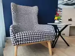When you enter the room, there is a bathroom on the right and an open wardrobe on the left. The security system is a key card. There is a small mini-pa next to the bathroom. There is a dining table with 3 chairs. The bed is a single bed that can be put together to be a king-sized bed. There is a sofa by the window with a table for sitting and drinking coffee while enjoying the view.