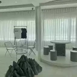 The shop is decorated with white sand and black rocks