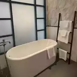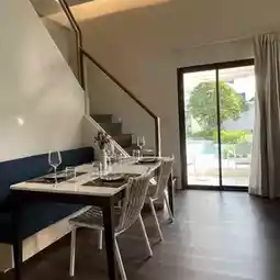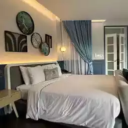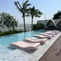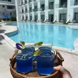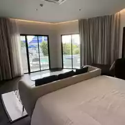 We chose to stay in a two-bedroom villa, an area of 250 sq m., with 2 bedrooms, a dining room and 2 bathrooms. There is a balcony where you can walk in the water near the pool and near the lounge. In the evening, the atmosphere is good. You can see the beautiful sunset. The hotel is by the sea but you cannot swim in the sea. It will be a mud beach. But the atmosphere is good and convenient for traveling to various places. Walking from the hotel, there will be famous and delicious restaurants in that area. Near Terminal 21 and Na Kluea Market, travel by car for about 3-5 minutes.