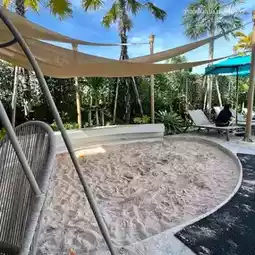 The hotel also has a new water park called The Wave, which simulates ocean waves. There are also slides for fun for both children and adults. There is a sand play area for children. In the fountain area, there are turtles spraying water. You will notice that there are staff taking care of every area.