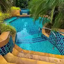 The atmosphere is shady, there is a simulated beach with a sea view, there are many swimming pools, you can enjoy a meal while watching the sunset.