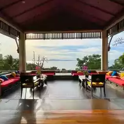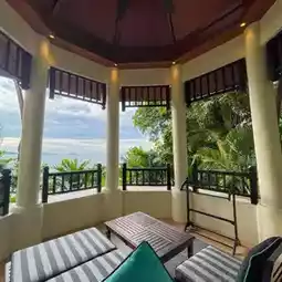 On the private Thai pavilion balcony, there is a sofa, table, clothes drying rack and fan. This area can see the sea view and the sunset.