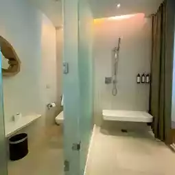 Bathroom 🚽🚿 are divided into proportions. Bath amenities use the elemental herbology brand.