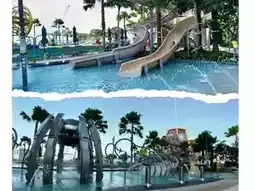 The poolside bar and Infinity Pool are basic features of a five-star hotel. On the other side of the pool plaza is a small water park with water cannons and slides. The hotel also has its own Sky Bridge aerial walkway.