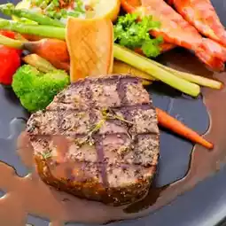 🌈Surf and Turf 1,550 ++ Large steak with large tiger prawns, served with baked potatoes, asparagus, baby carrots, very delicious.