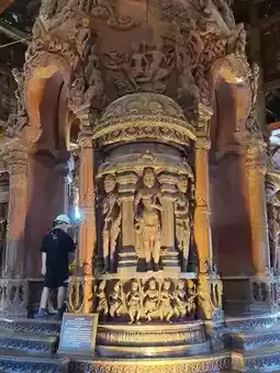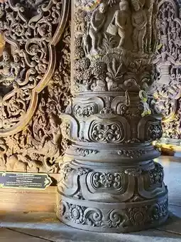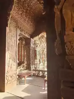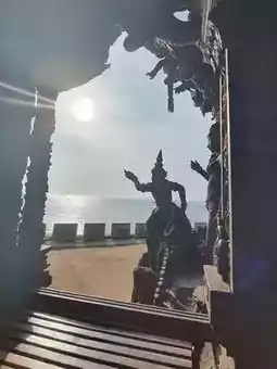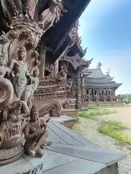 The Sanctuary of Truth Museum is located at Laem Ratchawet, Na Kluea Subdistrict, Bang Lamung District, Chonburi Province. It is a seaside castle built entirely of wood and is the largest in Thailand. It was built by Mr. Lek Viriyaphan, a businessman who loves Thai architecture and Buddhism. The castle is in a quadrangular (grand cathedral) architectural style, using 170 pillars and hardwoods such as teak, golden teak, and red wood. The roof is in the shape of a ship's hull, decorated with carved wooden sculptures according to ancient beliefs from wise men in the past. It is beautiful and magnificent. It is like a living museum that tells the stories of the Siamese people. The locals call it the Ancient Palace or the Wooden Castle. The interior is filled with philosophical content and arts and culture. Tourists like to visit to see its beauty and take pictures.