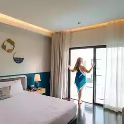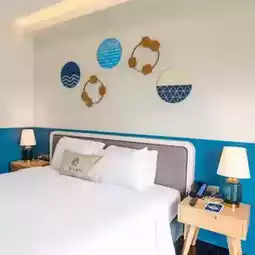 Fern stayed in a Deluxe Pool View room, which is still decorated in blue-white tones. The decorations are cute. There is a balcony where you can sit and enjoy the view of both the swimming pool and the sea. There are many types of rooms to choose from here. Fern visited another room, the Family Room Pool View, which is a room for families. There is a large bedroom that can be opened to meet a bunk bed for children. There is a spacious balcony. There is a bathtub in the bathroom. If you come as a family, Fern recommends this room.