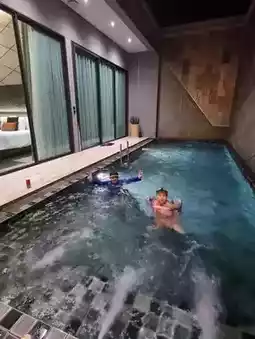 🦋I like it very much. When I got out of bed, I saw a pool villa next to the room. In my opinion, it is quite big. It is also a saltwater pool. It is very good. The atmosphere is very good. The pool is very beautiful and matches the room. There is a balcony and a table to sit by the pool.