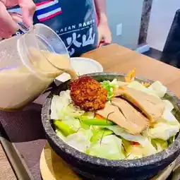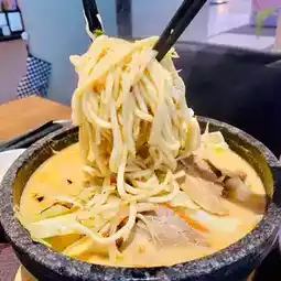Red volcano crater ramen, served in a 300-degree hot stone bowl. Large ramen noodles served with rice. Spicy Japanese soybean pork bone soup (spicy)