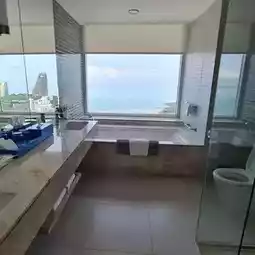 The building in front of the sea, the room is spacious, divided into a living room, a bathroom and a bedroom, a bathroom, a bathtub with a beautiful view, soaking in the water and enjoying the view of the Pattaya sea