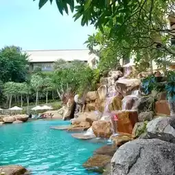 Another highlight is their stunning swimming pool. It's large and spacious, with crystal-clear blue water that's perfect for taking photos. There's a chic island in the center, creating a beachy vibe. The waterfall is also decorated, making it feel like you're in a water park. Perfect for families and kids, it's a great place to relax and enjoy the water.
