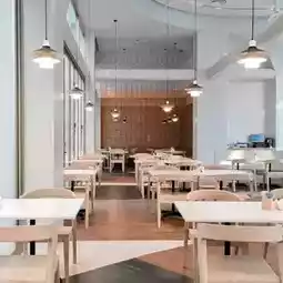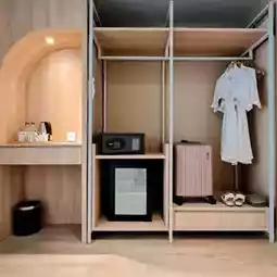 This hotel is designed with curves like the waves of the sea and uses light gray tones mixed with wood colors to create a warm feeling. This hotel is pet friendly with both