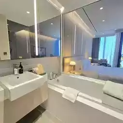 🚿 The bathroom has both a Rain Shower and a bathtub with complete amenities. The color is bright and comfortable.