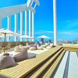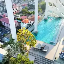 📍 The location of the hotel is in the central Pattaya area. Although it is not by the sea, it has something to make up for it, especially the swimming pool on the top floor of the hotel with complete facilities. The atmosphere is very good. There are also spacious rooms with a condo feel.