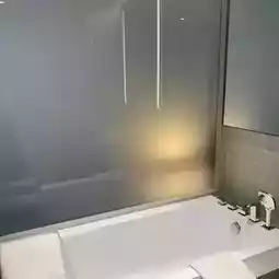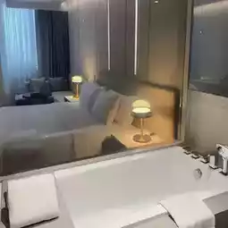 The room I got was very spacious. There was a bed, sofa, and all kinds of kitchenware. The bathroom was divided into sections with a bathtub. And the best thing is that you can see the bathroom and bed. You can see inside and outside like this, right? Don't worry. Normally, other places have curtains, right? But here, they have privacy glass switches. It's very good. It's the first time I've seen it here. It's cutting edge!