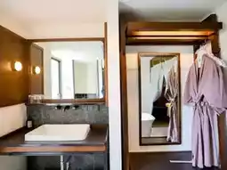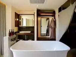 🚪Let's continue to the guest rooms. The guest rooms are decorated in the Thappraya camp theme. There are many room types to choose from. The rooms are spacious and have a gimmick that is curtains like tents in the army. Decorated with storytelling paintings according to the hotel concept, there is a bathtub, a bathroom with separate wet and dry zones, and various amenities are provided.
