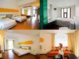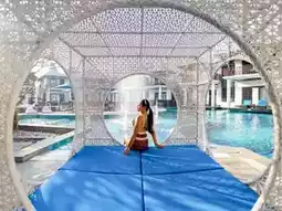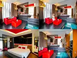 Maldives style, with a swimming pool surrounding the room, many beautiful photo spots