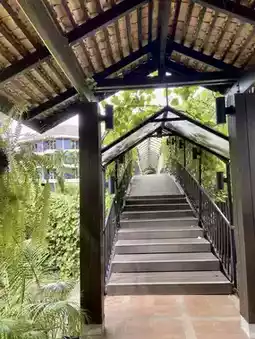 A nice hotel with a main building with lobby (with beautiful orchids all over) and sea facing rooms, and then a walk over a bridge that passes over the city sewer canal to the other garden facing rooms. Due to this sewer canal the pool area and garden rooms had a continuous pervasive sewer smell. To avoid this bridge the hotel has a buggy service from the lobby to the garden rooms. The breakfast was nice with a large choice of continental, Indian and Thai breakfast, eggs to order, freshly cut fruit, breads, salads, pastries, sushi etc. the staff are friendly, courteous and eager to help. Beware some rooms described as garden facing actual have a balcony that ends in approx 14ft wall. They don't have free ice and the quality of the free toiletries need improvement. The WiFi signal was poor and after many complaints they somehow improved it. The hotel is on a huge property facing the sea at the beginning of Walking Street. Lots of night clubs, restaurants, massage places right next door.