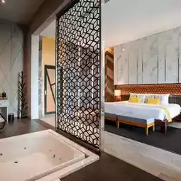 A pool villa where you can walk straight from the bed into your private onsen pool.