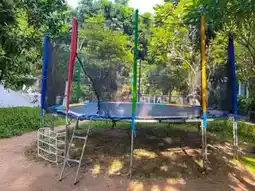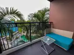 The balcony of the room is spacious, with a view of the trees and the pool. There is a sofa bed and a clothes drying area on the balcony.