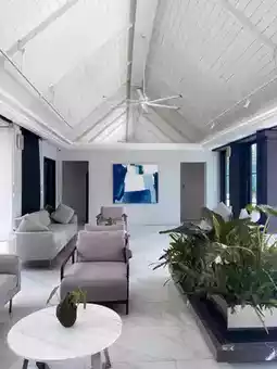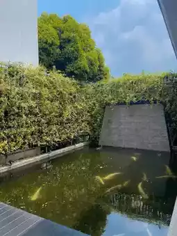 🏘The lobby area is an open-air area with a cool breeze. The white color gives a sense of openness and airiness. There are sofas for sitting and waiting to check in. Small trees are decorated to look fresh and pleasing to the eye. Next to the lobby is a walkway to the guest room building. There are koi ponds on both sides of the walkway.