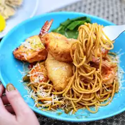 ⭐ Thai-style spaghetti with shrimp, Thai-style sauce, topped with fried shrimp. It should please many people.